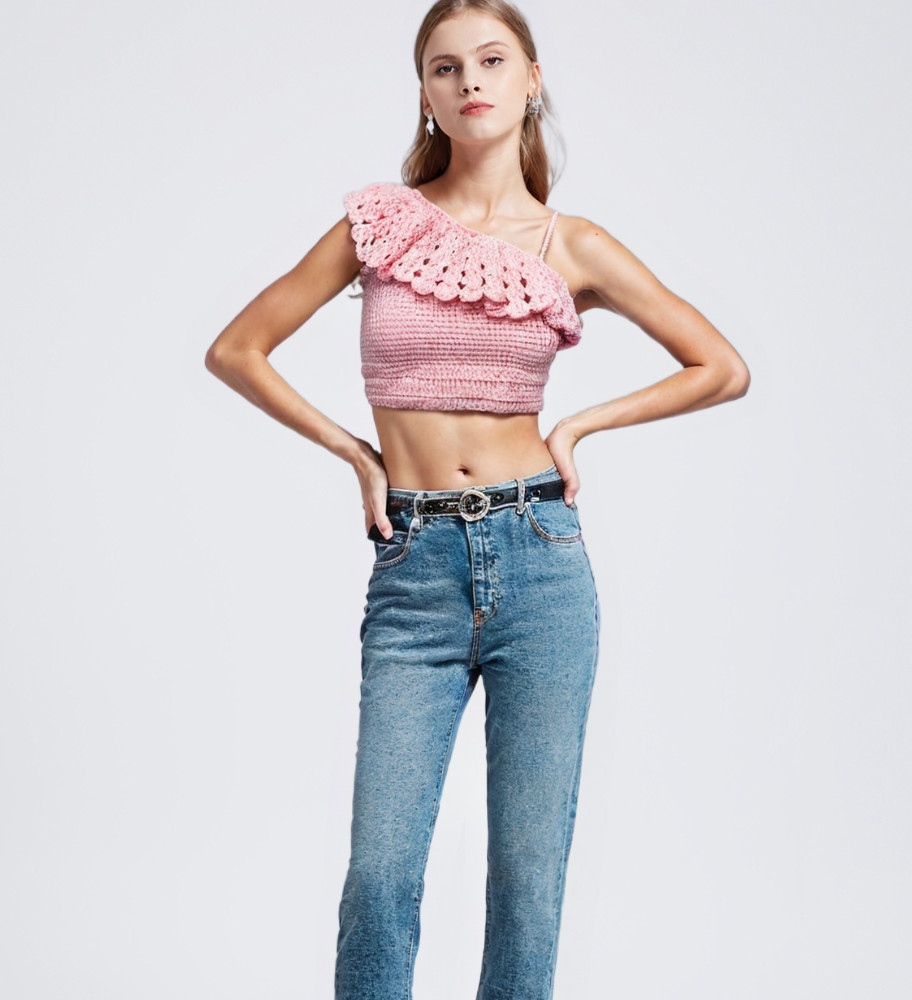 Delicate, feminine, and effortlessly chic — the Rosé Ruffle One-Shoulder Top is a showstopper in soft blush pink. Hand-crocheted with a snug, ribbed body and adorned with a wide scalloped ruffle, this asymmetrical crop top beautifully flatters the neckline and shoulders. Its elegant single-shoulder design makes it perfect for dressy day looks or a romantic evening out.